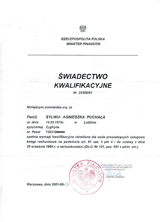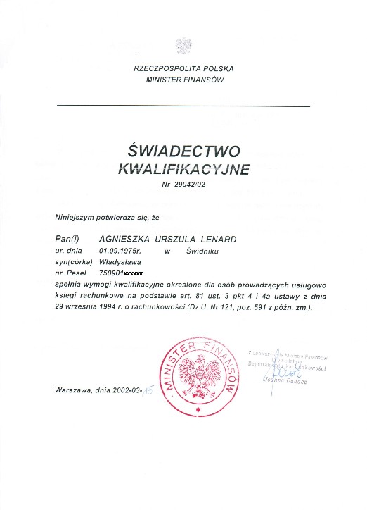 Certyfikat - Biuro Rachunkowe A&S Agnieszka Lenard, Sylwia Sławacka